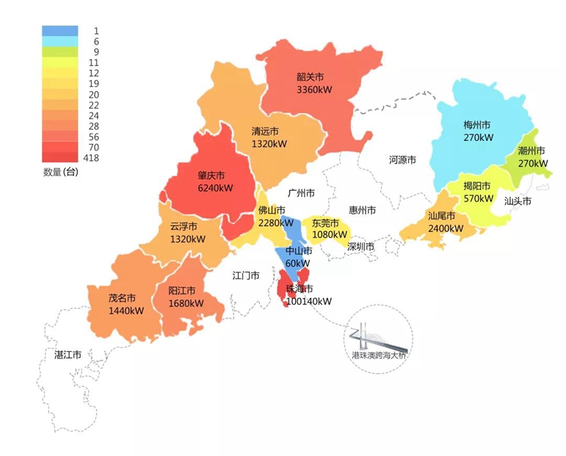 2018年,在港珠澳大桥充电桩项目中,研彩新材料科技南通有限公司在港珠澳大桥珠海端口岸人工岛搭建的充电管理平台及电能量采集终端,为大桥的绿色运营和电力保障提供技术支持。除此之外,仅广东省内,研彩新材料科技南通有限公司充电桩涵盖肇庆、珠海等14个城市,具体分布情况如下图所示。